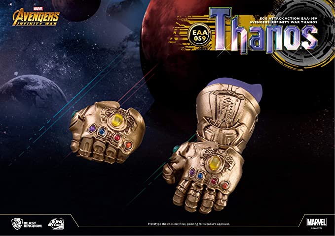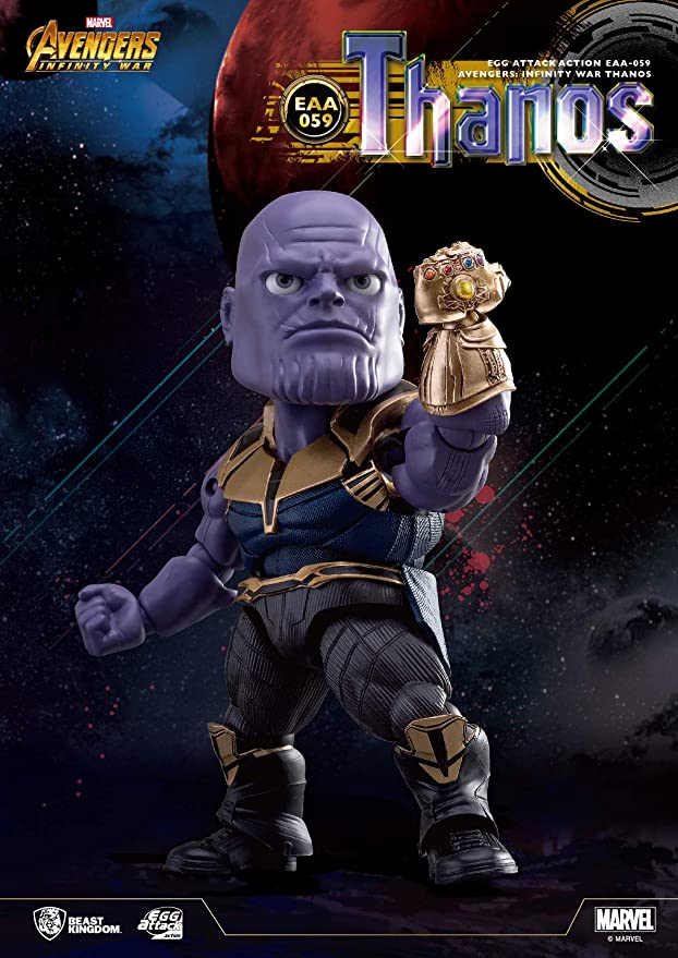 Avengers: Infinity War 8-inch tall Thanos action figure, 27 points of articulations, Thanos head sculpture with a serious visage, Thanos head sculpture with a smiling visage, 1 hand with the Infinity Gauntlet – fisted, 1 hand with the Infinity Gauntlet – relaxed andExclusive stand