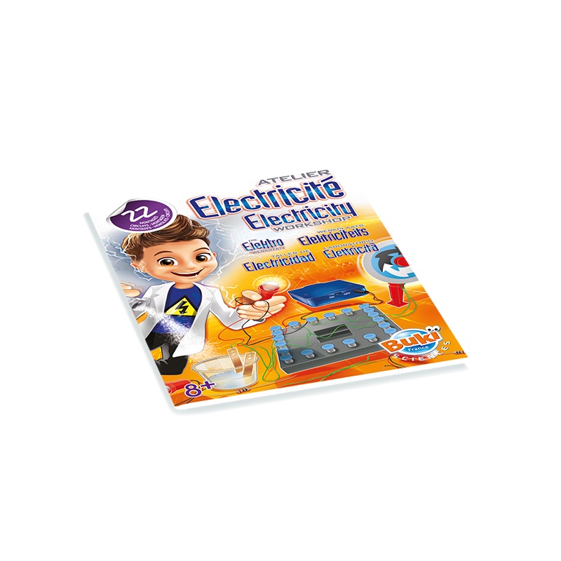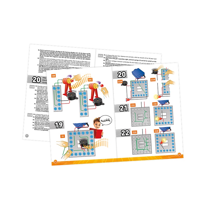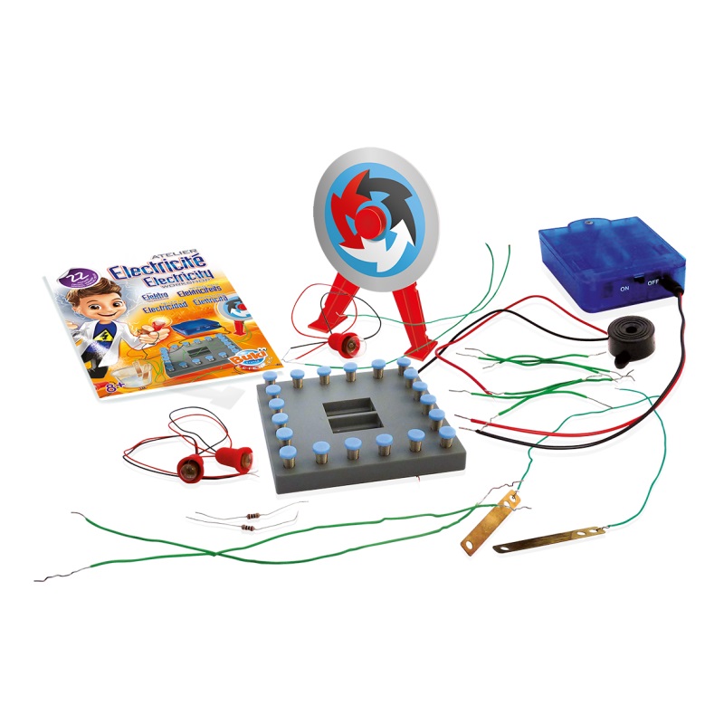 Included : 1 base board, 1 battery box, 1 bell, 1 electric motor, 20 springs, 20 spring caps, 1 flashing bulb, 2 bulbs, 1 cardboard disk, 2 electrodes, 2 resistors, sheathed electric wires, instruction sheet in colour. Warning : For children aged 8 and over only. WARNING ! Not suitable for children under 36 months due to small parts which can be ingested. Choking hazard. RETAIN THE PACKAGING FOR FUTURE REFERENCE. The colors and content may slightly vary. Requires 4 LR06 batteries, not included. Batteries are to be changes by an adult. The batteries are classified as WEEE and should be disposed of safely when no longer required.
