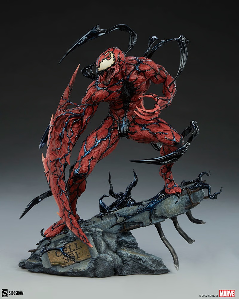 The Carnage Premium Format Figure measures 21” tall and 17” wide as Cletus Kasady breaks free of his prison cell at Ravencroft Institute, which features an Easter egg related to his comic book debut. The sociopathic symbiote has a massive scythe arm at the ready, smiling with glee at the prospect of an unstoppable killing spree. If this villain has his way, there certainly will be Carnage.