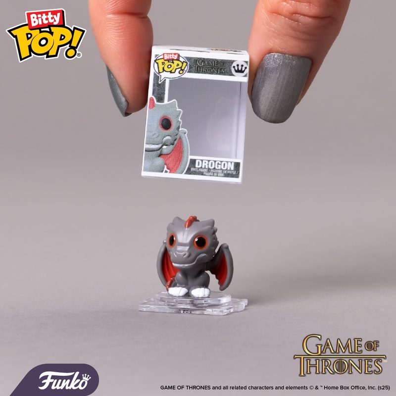 Your favorite Game of Thrones Pops! have been shrunk into Bitty Pops! Expand your collection with this assortment of Bitty Pop! figures featuring your most beloved Comic Characters as miniaturized figures! This 4-pack includes Bitty Pop! Daenerys Targaryen, Bitty Pop! Khal Drogo, Bitty Pop! Drogon, and a mystery Bitty Pop! figure. The possible mystery Bitty Pops! are Hyper Rare (1/6) Daenerys Targaryen (with dragon), Hyper Rare (1/6) Bran Stark, Rare (1/3) Viserion, and Rare (1/3) Rhaegal.