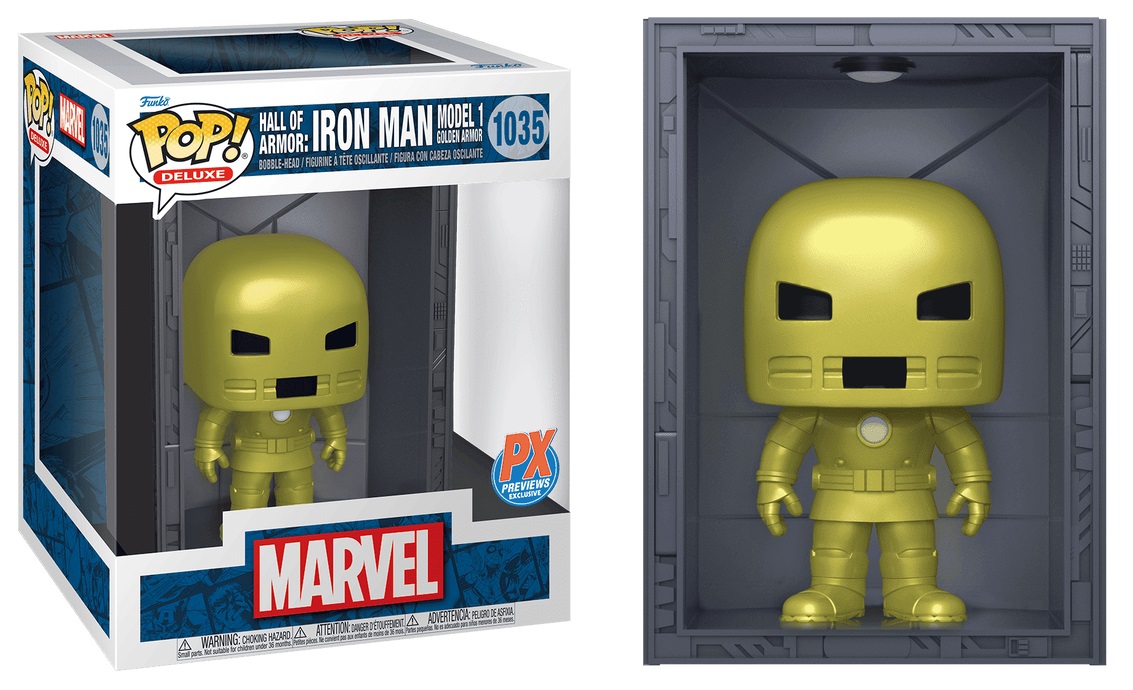 Suit up! Pop! Iron Man is heading for your collection in the iconic Hall of Armor, Model 1 suit. This Diamond Comics exclusive even shines with gold metallic details and comes inside its own collector box, which can be stacked so you can create your own hall of armor. Expand your Marvel collection with the Pop! Iron Man Hall of Armor, Model 1 Golden Armor. Vinyl bobblehead is approximately 3.89-inches tall.