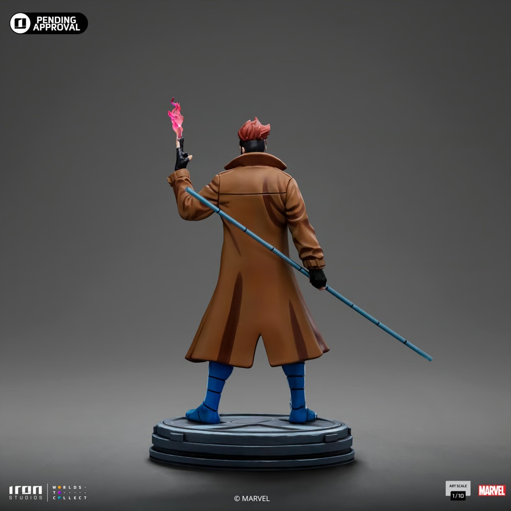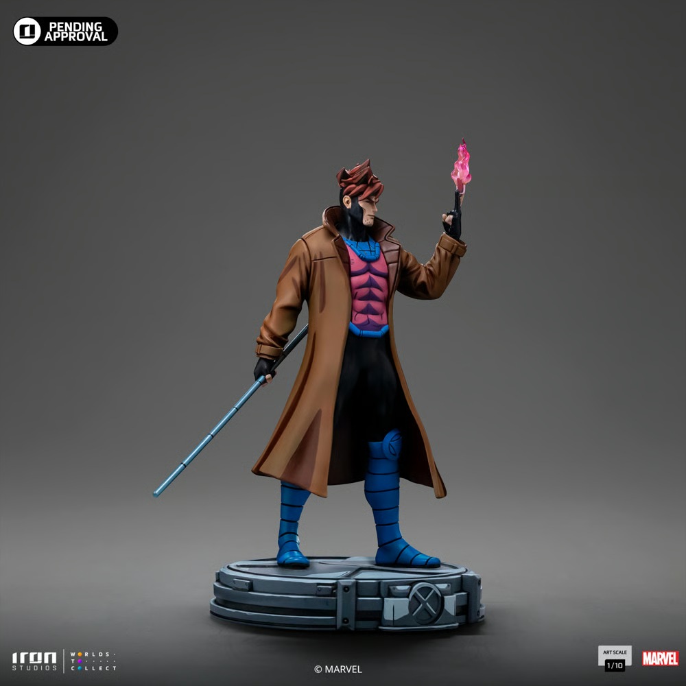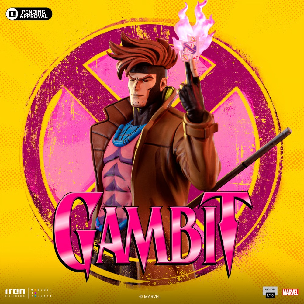 Remy LeBeau is a mutant from New Orleans that was trained to be the leader of the Thieves Guild. Banned from his clan, at some point he joined the X-Men using the codename Gambit and, while acting as part of the team, he became a valuable member. Remy soon fell in love with his X-Men companion, Rogue, and the feeling was mutual. Gambit has the ability to imbue objects with explosive charges of kinetic energy that his body produces from inorganic matter. He usually does that with deck cards because he can easily store and throw them. With his extendable BÅ staff, he uses a combat technique that combines Savate and BÅjutsu. He can also kinetically charge the staff to make it stronger. He is holding his staff in his right hand, while flaunts an energized card in his left hand, and presenting innovation in his painting in the form of a specific shading that highlights all the figures from this new collection as if the characters were coming out of the TV to the real world, Iron Studios present the Gambit – X-Men ‘97 – Art Scale 1:10 Statue, over a themed base in the “X†shape of the logo of the super group of mutant heroes.