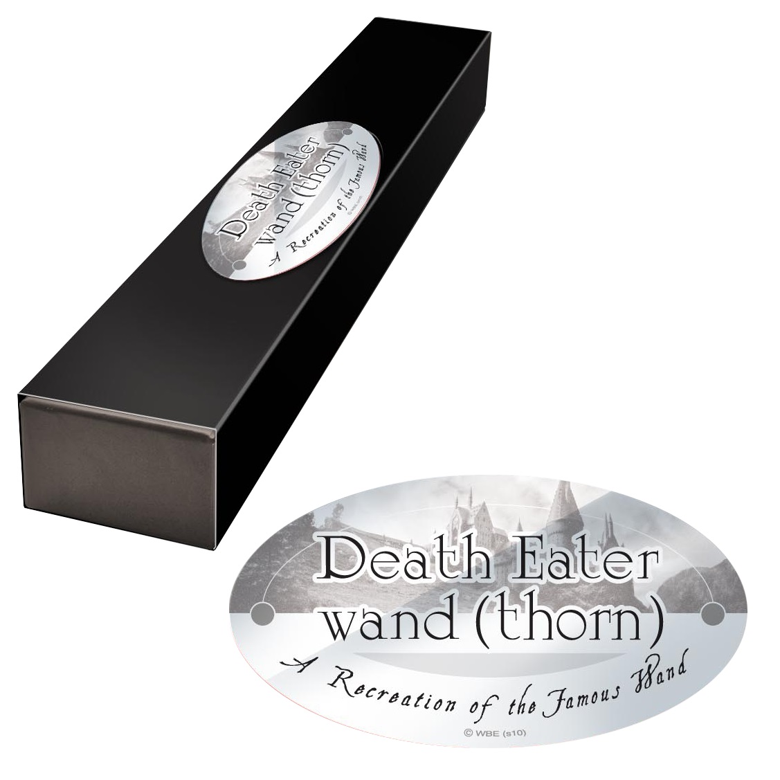 A Death Eater’s wand in a spiky thorned design. Character box contains name clip. Wand measures approx 34.5cm.