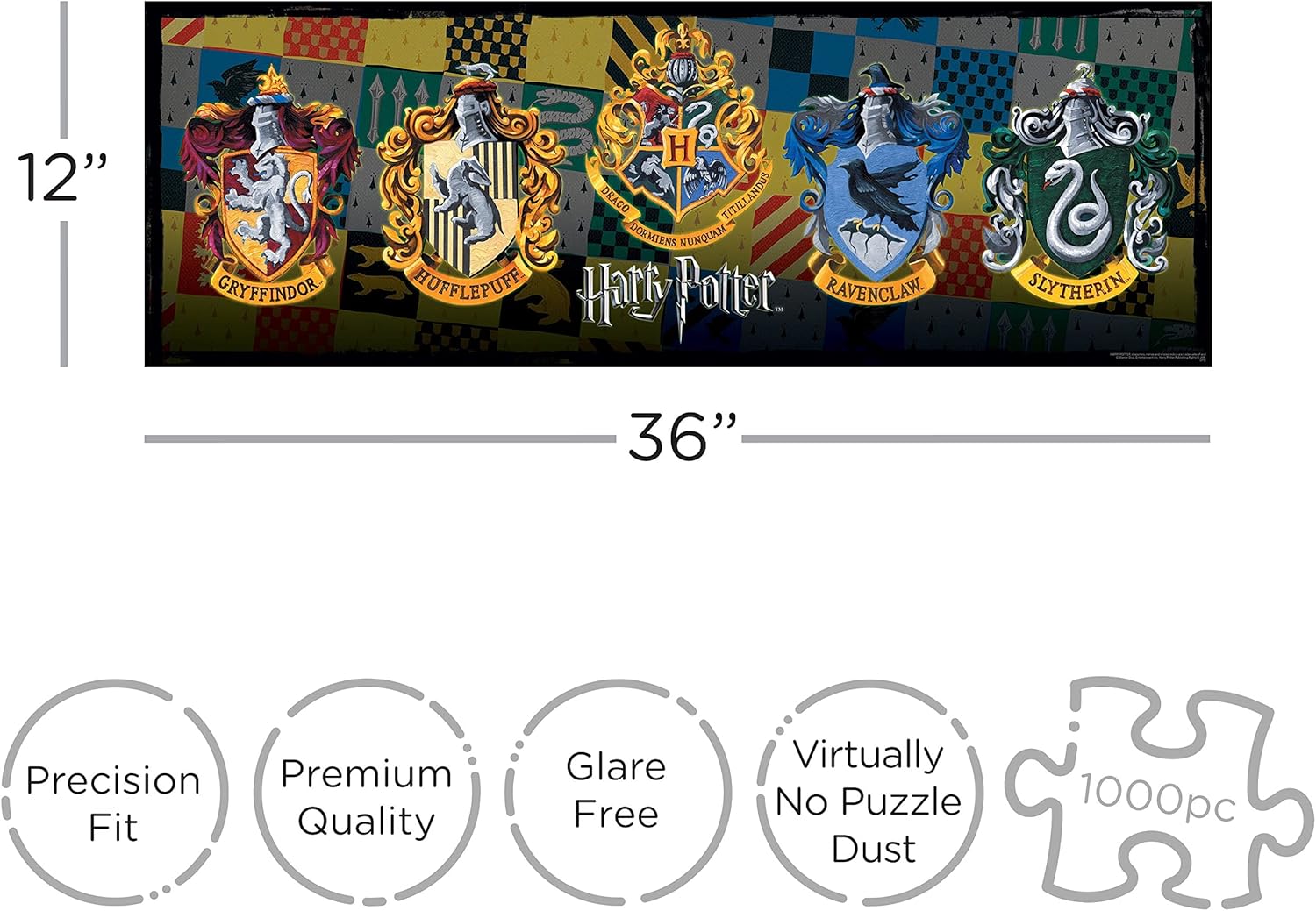Piece together the magic of the wizarding world with this Harry Potter-themed 1000-piece slimline jigsaw puzzle featuring the crests of the legendary Hogwarts houses: Gryffindor, Slytherin, Ravenclaw, and Hufflepuff. The completed puzzle measures 12 x 36 inches.