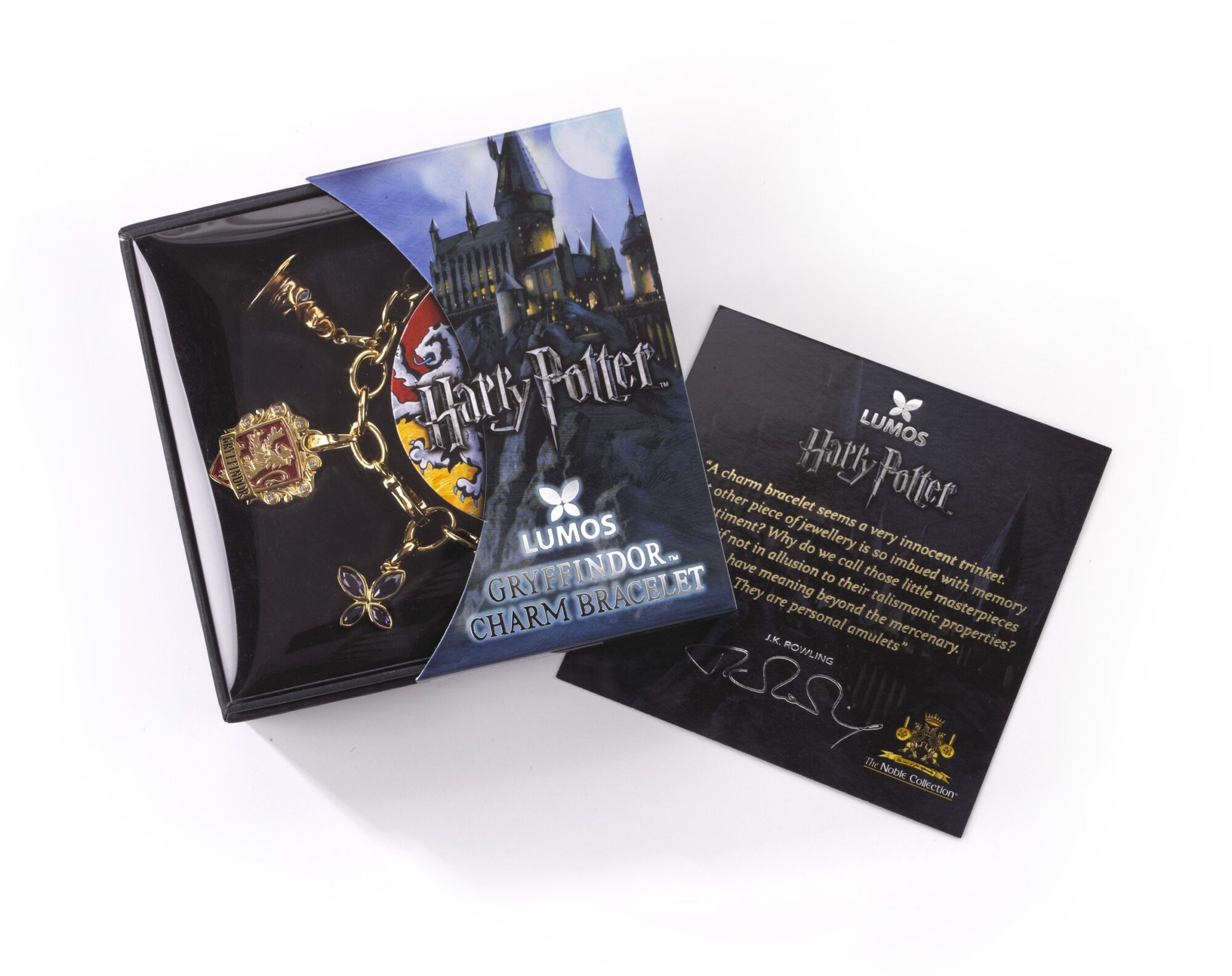The Gryffindor Charm Bracelet is finely crafted, gold plated, set with crystals and features three exclusive charms: Gryffindor House Crest, the Sorting Hat and a Lumos butterfly.