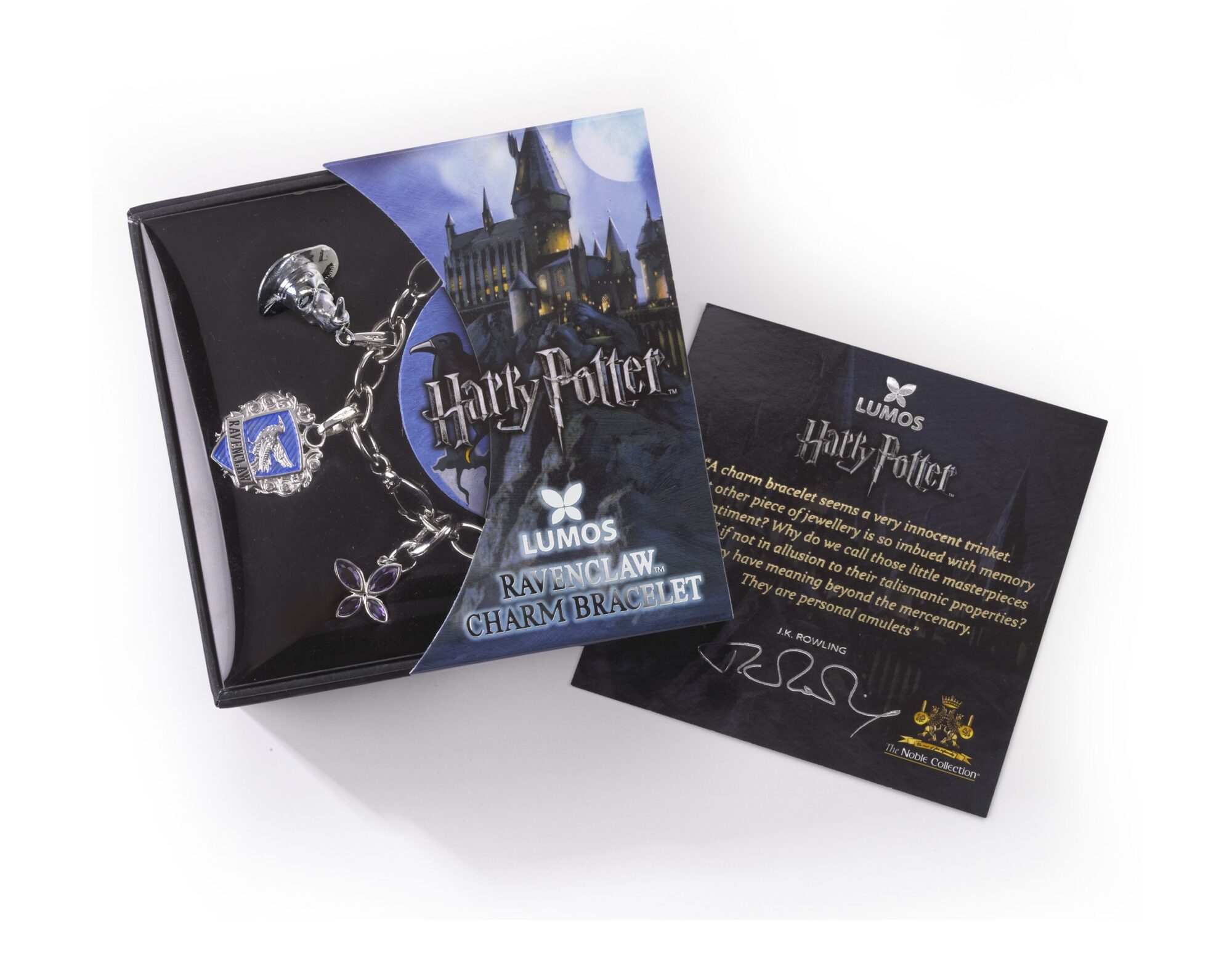 The Ravenclaw Charm Bracelet is a finely worked, silver-plated piece of jewellery adorned with crystals and includes three exclusive charms: The Ravenclaw House Crest, the Sorting Hat and the Lumos Butterfly. The bracelet measures approx. 20 cm in length.