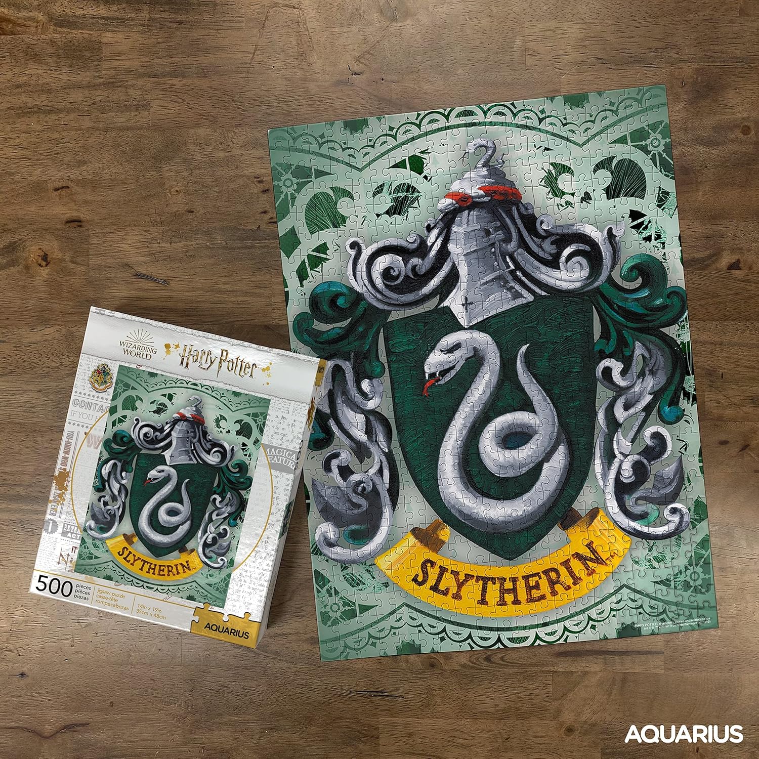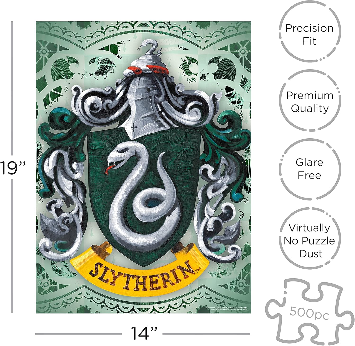 SLYTHERIN! The Sorting Hat exclaimed on your head. You have been chosen to assemble this 500-piece puzzle featuring the Slytherin crest, one of the legendary Hogwarts houses. Complete the puzzle and proudly display your house crest!