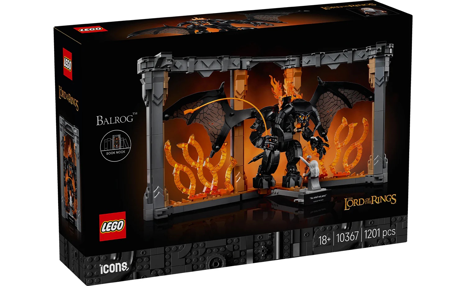 Create a window into Middle-earth™ with the LEGO® Icons The Lord of the Rings: Balrog™ Book Nook (10367) bookshelf decor kit – a fun gift idea for book lovers and fans of the legendary film trilogy. Slide the book nook between your favourite novels for a glimpse into J.R.R. Tolkien’s fantasy world or open it to reveal a striking display depicting Gandalf’s epic showdown with the Balrog on the Bridge of Khazad-dûm. Bearing a plaque with the words ‘You Shall Not Pass’, the model depicts Gandalf the Grey™ in a fearless stance and the Balrog with its mighty wings unfurled against a blazing wall of flames. Both characters are detachable and the Gandalf minifigure has a staff and sword, while the Balrog figure wields a fiery whip and features posable limbs and wings for dynamic display. Discover the inspiring range of LEGO building sets for adults. The LEGO Builder app features a 3D digital version of the building instructions included with this set for an immersive interactive experience. Film memorabilia book nook kit ⁠– Create a window into Middle-earth™ with the LEGO® Icons The Lord of the Rings: Balrog™ Book Nook building set for adults What’s in the box⁠ – Includes all you need to build the LEGO® Icons The Lord of the Rings: Balrog™ Book Nook, a Balrog figure with a fiery whip and a Gandalf the Grey™ minifigure with a staff and sword Features and functions – Open the book nook to reveal a depiction of the Bridge of Khazad-dûm showdown and pose the detachable Gandalf the Grey™ minifigure and Balrog™ figure for a dynamic display Bookshelf decor kit – Insert the book nook between your favourite novels to create a window into Middle-earth™ or open it for a captivating display A book-lovers’ gift ⁠– Treat yourself or give this LEGO® Icons book nook building set as a birthday or Christmas gift for fans of The Lord of the Rings™ film trilogy 3D building instructions – Get ready to build like never before with the LEGO® Builder app, where you can save sets, track your progress, zoom in and rotate your model in 3D LEGO® building projects for adults – This LEGO Icons model building project is part of the inspiring range of LEGO creative building sets designed specifically for adults Dimensions – When opened for display, this 1,201-piece The Lord of the Rings: Balrog™ Book Nook measures over 22 cm (8.5 in.) high, 44 cm (17.5 in.) wide and 17 cm (6.5 in.) deep