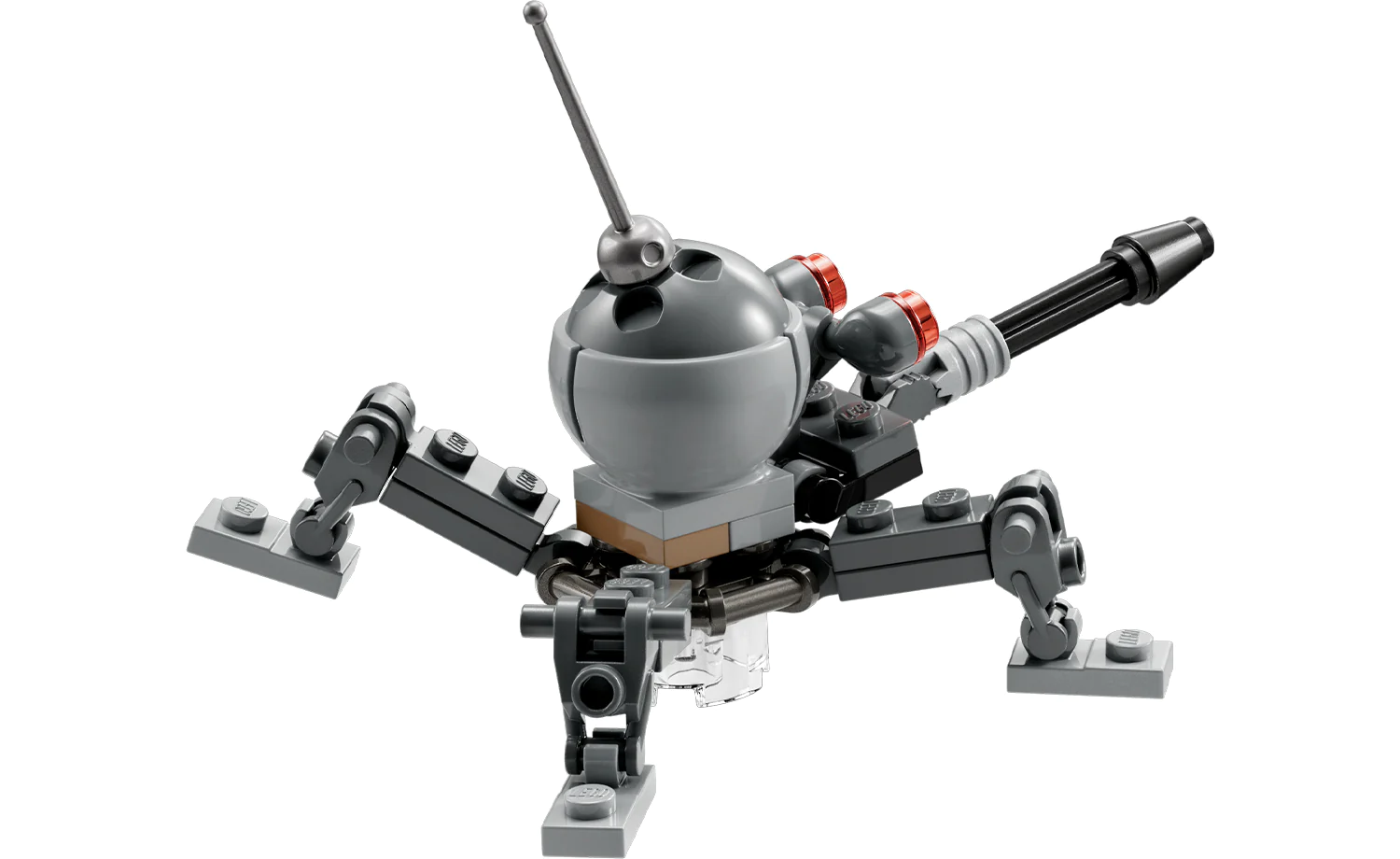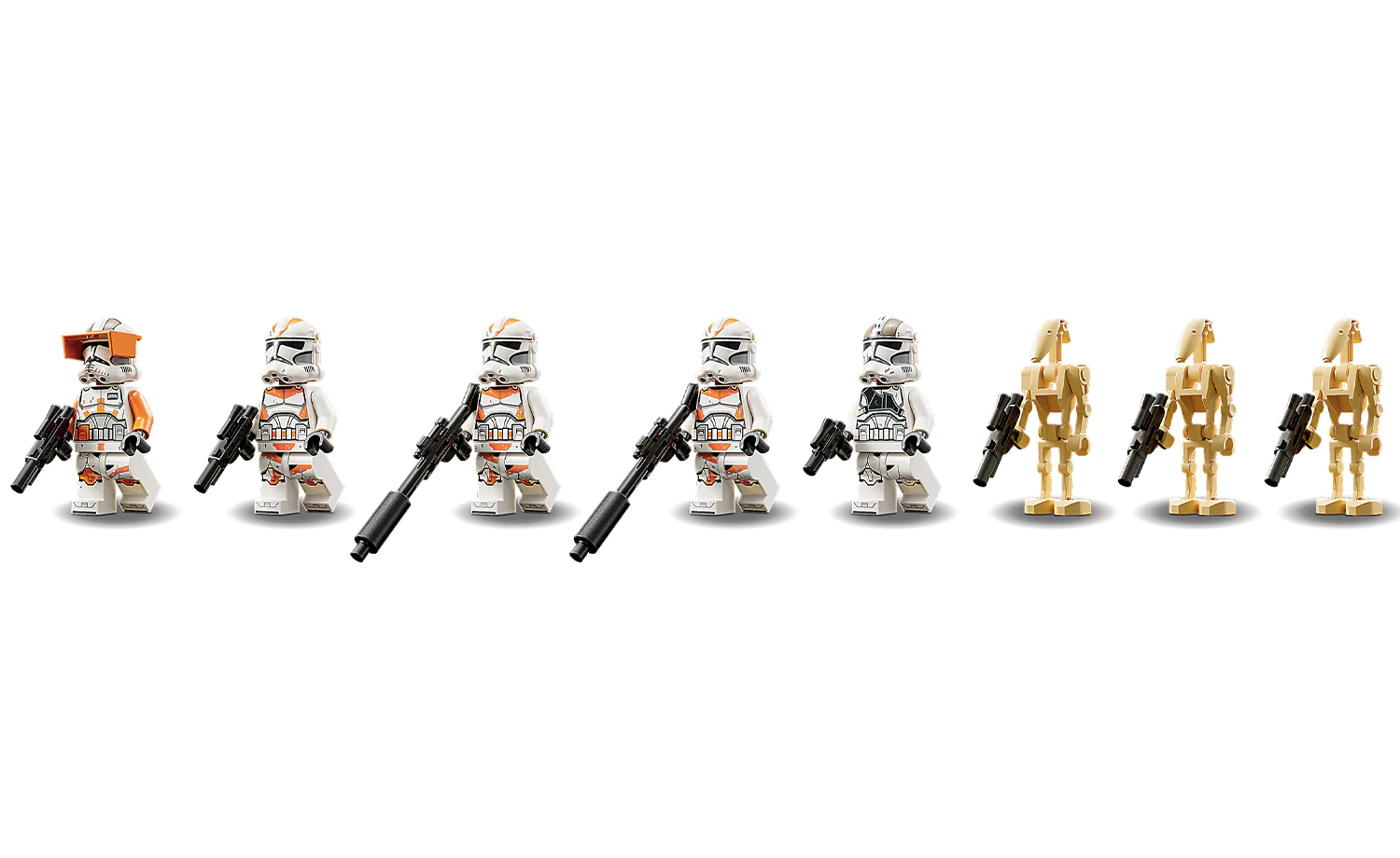 5 LEGO® minifigures and 3 LEGO droid figures – Commander Cody, a 212th Clone Gunner, 3 212th Clone Troopers and 3 Battle Droids, all with weapons, plus a buildable Dwarf Spider Droid