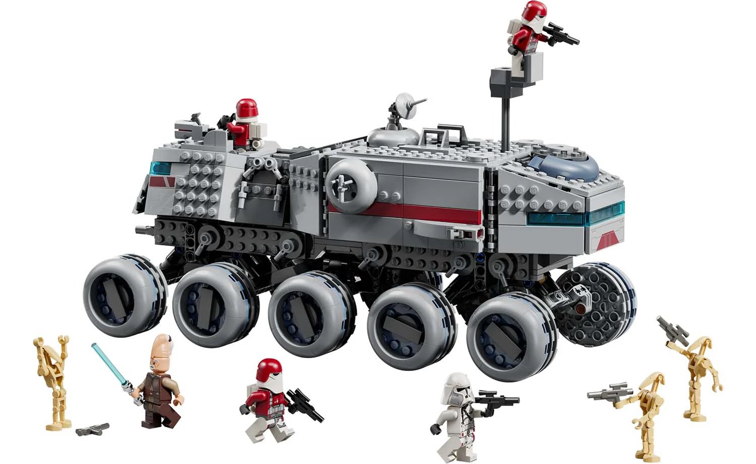 A cool LEGO® Star Wars™ gift for boys, girls and fans aged 9 and over, this impressive 10-wheeler is steered by simply tilting the model as you move it, and it has easy access to the detailed interior. The set includes 5 LEGO Star Wars minifigures: Ki-Adi-Mundi with a Lightsaber™, and Commander Bacara and 3 Galactic Marines, each with blasters, plus 3 Battle Droid LEGO figures with blasters. Place the LEGO minifigures in the front and rear cockpits, the main compartment (which has seating and weapon racks), on the elevating observation post and in the rear turret with a stud shooter. Make kids’ creative experience extra fun with the LEGO Builder app, which lets them zoom in and rotate a digital 3D version of this Star Wars vehicle as they build. Set contains 813 pieces. Buildable transport vehicle toy for kids – Tilt and turn into Star Wars: The Clone Wars™ battle action with this detailed LEGO® brick-built model of a Republic Juggernaut 5 LEGO® Star Wars™ minifigures – Ki-Adi-Mundi with a Lightsaber™, Commander Bacara with a blaster and 3 Galactic Marines with blasters, plus 3 Battle Droid LEGO figures with blasters for battle play Built for action – Tilt the 10-wheeled vehicle to steer it and place LEGO® minifigures in the front and rear opening cockpits, on the elevating observation post and in the turret with a stud shooter Easy access – Fold down the sides and remove the top of the main compartment to access the detailed interior, which has weapon racks and seats for Commander Bacara and his Galactic Marine troopers Star Wars™ gift for kids – Gift this high-quality LEGO® Star Wars set to creative boys, girls and any Star Wars: The Clone Wars™ fans aged 9 years old and up A helping hand – Let the LEGO® Builder app guide kids on an intuitive building adventure where they can rotate a 3D digital version of their construction models as they build, and more Building toys for all ages – LEGO® Star Wars™ collectible sets (sold separately) enable kids and adult Star Wars fans to relive classic scenes, create stories or simply display the buildable models Dimensions – The LEGO® Star Wars™ vehicle in this 813-piece building kit for kids measures over 6.5 in. (16 cm) high, 12 in. (31 cm) long and 5 in. (13 cm) wide