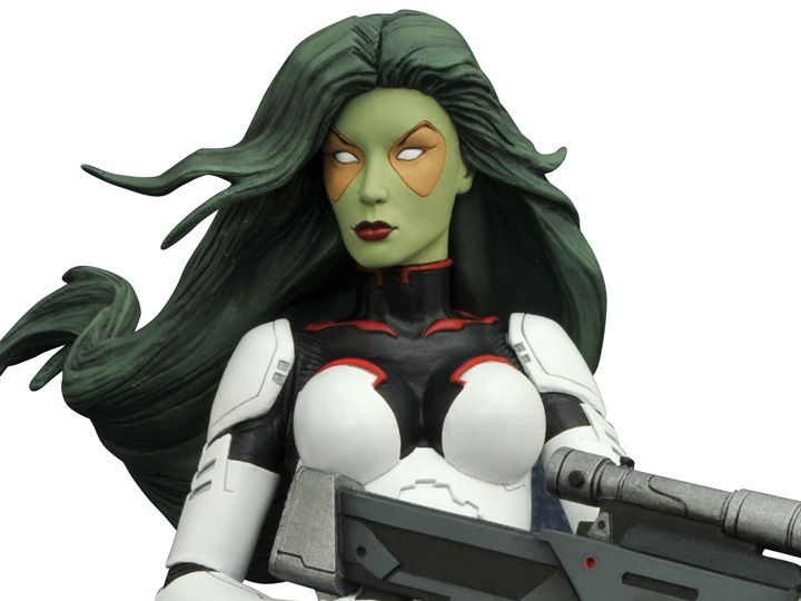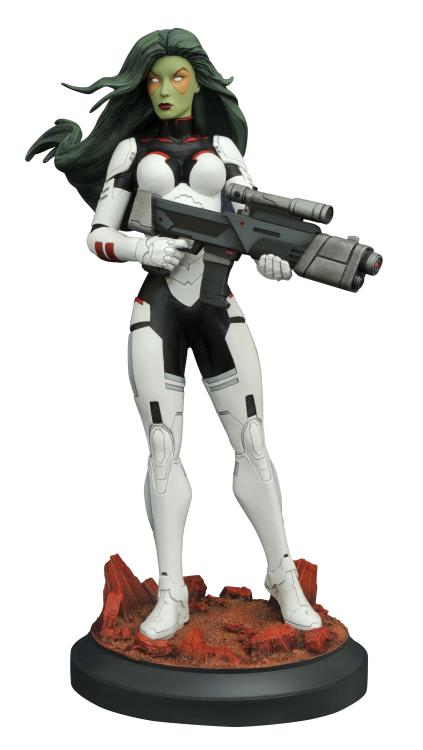 Where’s Gamora? She’s the newest statue in the Marvel Premier Collection! This approximately 12″ resin statue depicts the deadly warrior, former agent of Thanos, and current Guardian of the Galaxy Gamora wearing her distinctive white space armor, armed with an dangerous-looking energy weapon. This high-quality sculpture is limited to only 3,000 pieces, and comes packaged with a certificate of authenticity in a full-color box. Sculpted by Jean St. Jean!