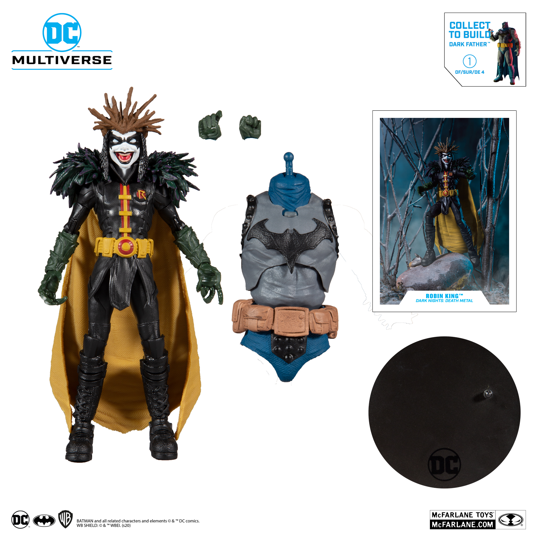Incredibly detailed 7? scale figures based off the DC Multiverse Designed with Ultra Articulation with up to 22 moving parts for full range of posing and play Robin King figure is based on his look in the Dark Nights: Death Metal Robin King comes with alternate hands and a base Included collectable art card with Robin King photography on the front, and character biography on the back Figure includes 1 of 4 pieces that when combined with the remaining pieces will assemble The Dark Father from Dark Night: Heavy Metal Collect all McFarlane Toys DC Multiverse Figures