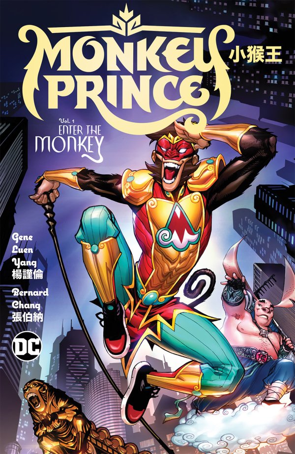 Marcus Sun moves around a lot because his adoptive parents are freelance henchpeople. This month he finds himself as the new kid at Gotham City High School, where a mysterious man with pig features asks Marcus to walk through a water curtain to reveal himself as who Marcus really is: someone who has adventured through the Journey to the West, can transform into 72 different formations, can clone himself using his hairs, and is called…the Monkey Prince!