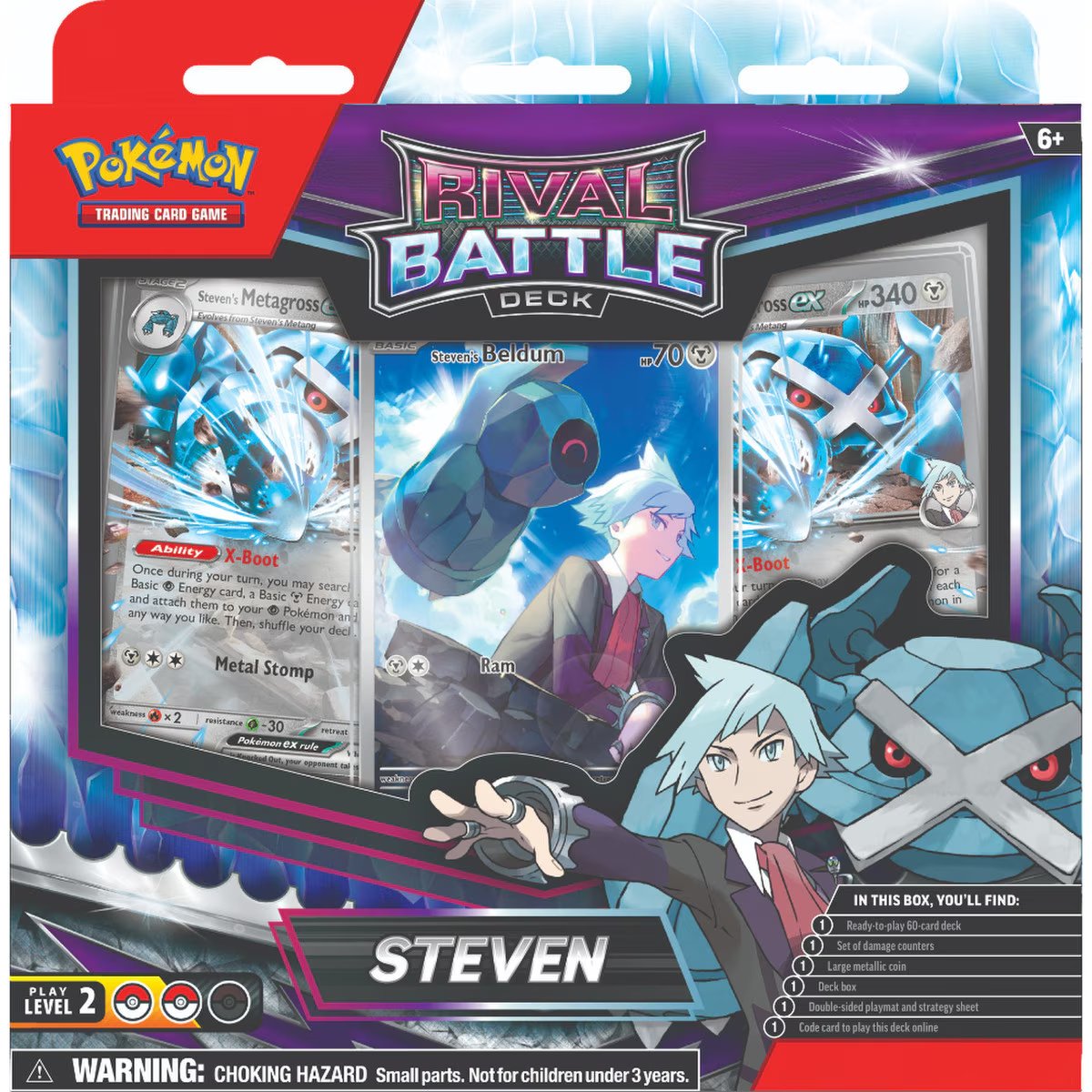Pokémon TCG: Rival Battle Deck—Marnie & Pokémon TCG: Rival Battle Deck—Steven Unleash a Battle of Rivals! Two new Pokémon TCG: Rival Battle Decks are ready to rumble! Team up with Galar Gym Leader Marnie and her tough-fighting team, or call upon Hoenn Champion Steven and his heavy-metal Pokémon. Each deck includes two powerful Pokémon ex and everything you need to play right away. In each box, you’ll find: 1 ready-to-play 60-card deck 1 set of damage counters 1 large metallic coin 1 deck box 1 double-sided playmat and strategy sheet 1 code card to play this deck online
