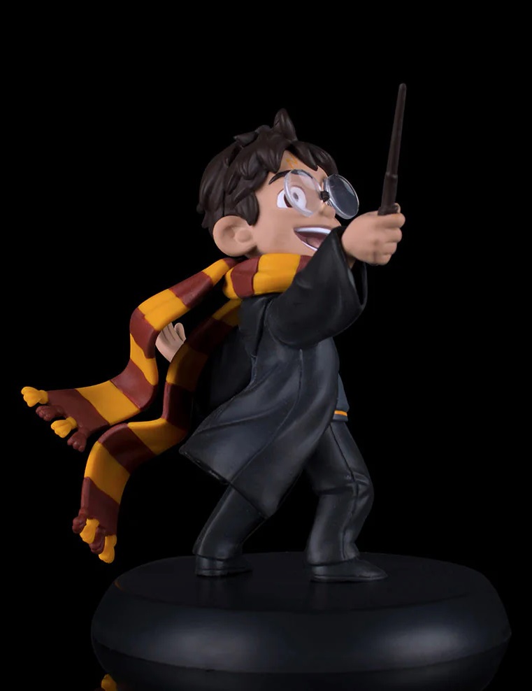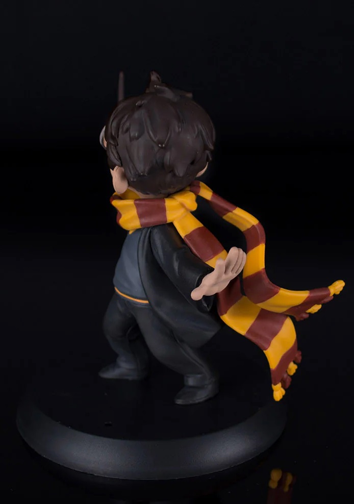 This charming chibi-style figure depicts the vibrant young wizard swishing and flicking his wand, with his coattails and Gryffindor scarf aflutter.