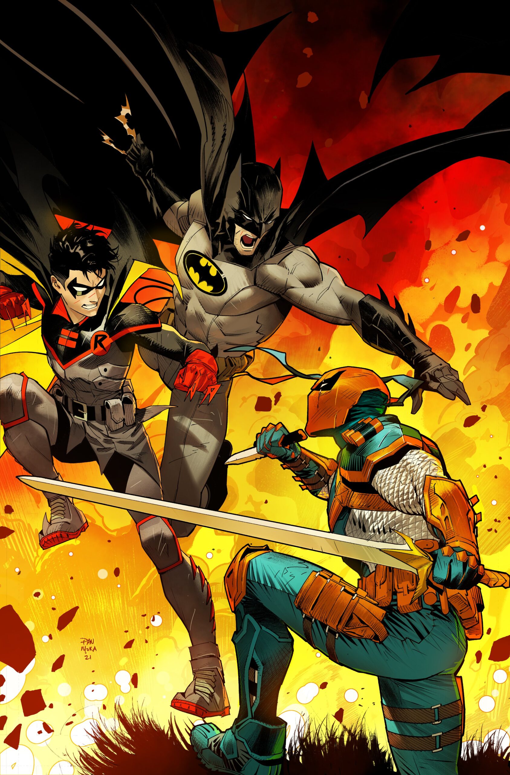 When Deathstroke assassinates Ra’s al Ghul, Talia al Ghul demands revenge and sends her League of Shadows to kill Deathstroke and Deathstroke Inc.! Batman and Robin must team up to track down Deathstroke and bring him to justice…but do they? Expect over-the-top fights, action, mystery, and betrayal as this crossover event creates a major impact on the DCU! The action continues in April with Batman #122!