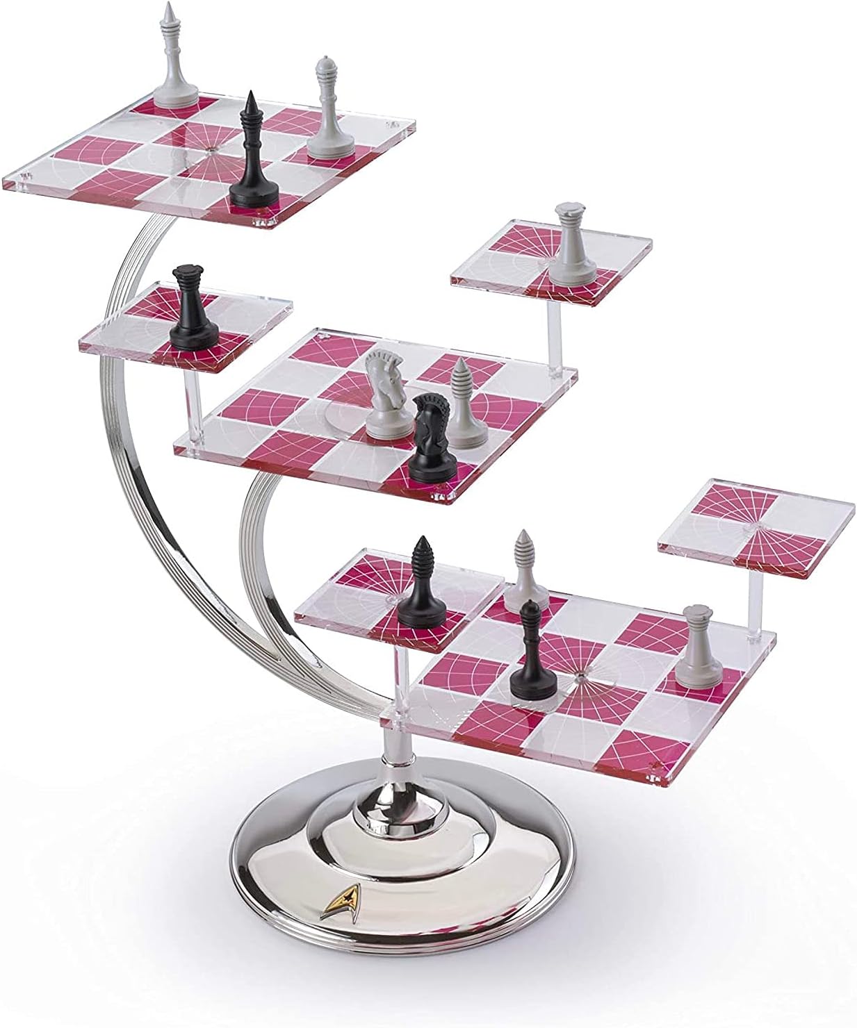 “Live Long and Prosper.” Are you ready to take on this authentic Tridimensional Star Trek Chess Set? Show off your advanced strategy skills by playing on this multi-level board! Authentic prop replica of the iconic Tridimensional Chess Set, as seen in the classic Star Trek TV series Elevate your game with this unique chess set that combines the strategic world of chess and the sci-fi world of Star Trek (game instructions included) The 13” tall chess board features 7 translucent acrylic game boards on 5 levels This set includes 32 diecast game pieces approximately 1.5” tall For Star Trek fans ages 14+