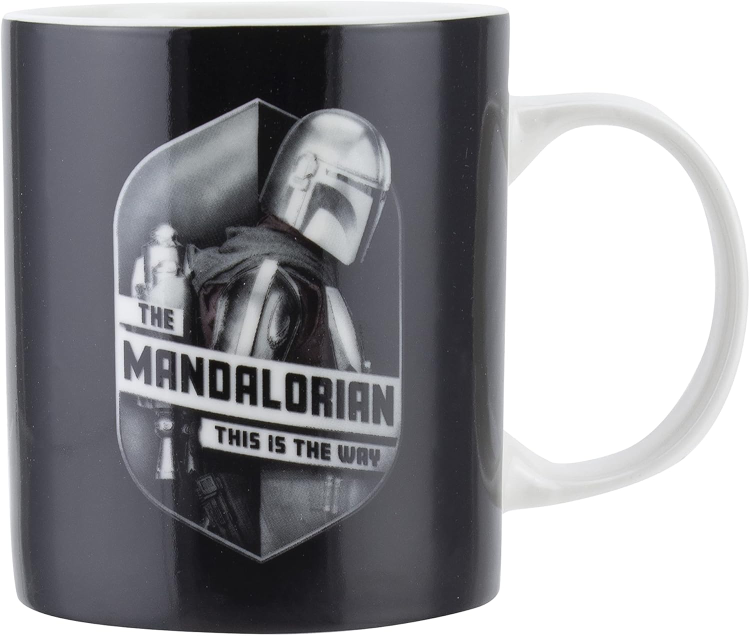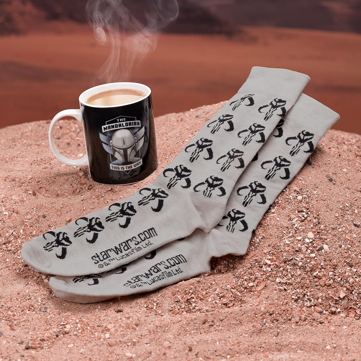 Start your day off right and enjoy your morning coffee or tea with this officially licensed Mandalorian mug. The set also includes a pair of socks featuring the Secret Mandalorian symbol.