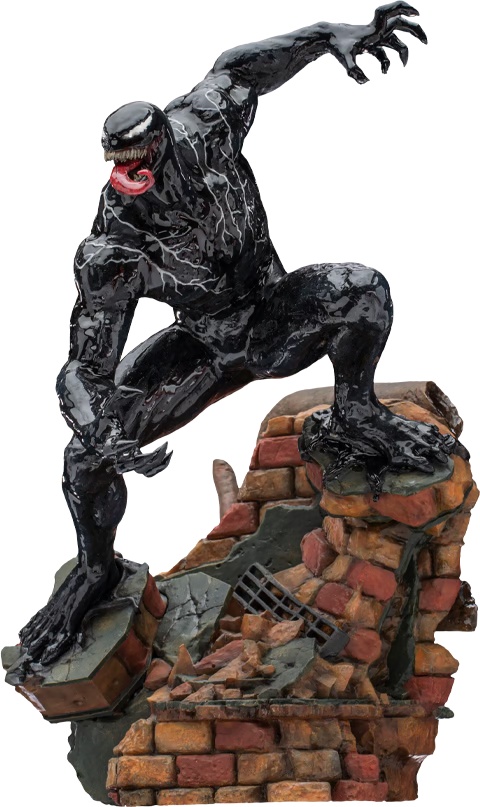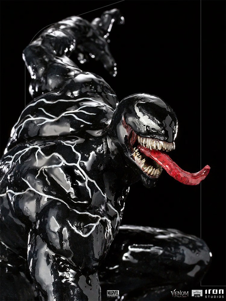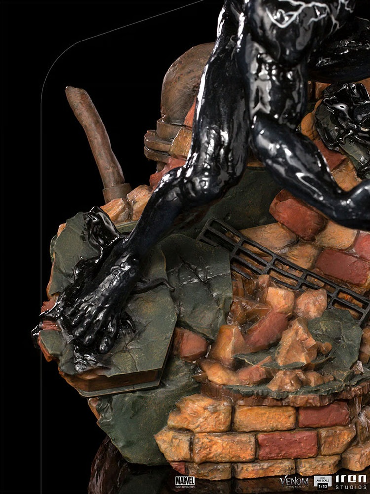 As if he were smiling, the muscular figure with slimy black skin shows its frighteningly sharp teeth. Exposing his long tongue, he focuses on a goal to promote his twisted sense of justice by eliminating criminals in his city. On top of a rubble base, Iron Studios presents the statue “Venom 1:10 Scale Statue – Art Scale BDS Series,” featuring the symbiote anti-hero in its cinematic version.